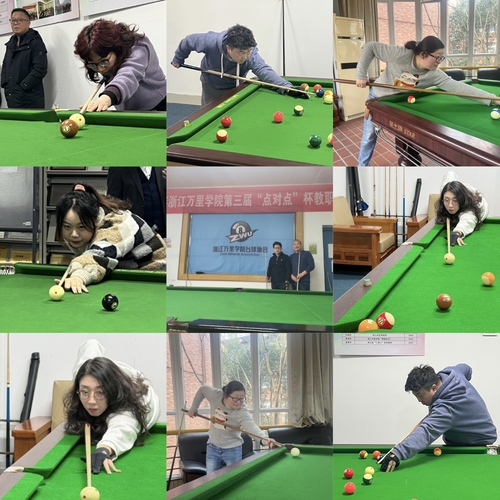 4月1日,第三届浙江万里学院教职工台球比赛圆满收官。外语学院派出精兵强将参与全部赛事项目,包括团体赛(薛瑞霖、沈涛、韩颖)、女子个人赛(金永嘉、韩伟、朱秀丽、韩颖、杨小敏)和男子个人赛(薛瑞霖、刘俊辉、潘石杰)。经过多轮激烈比拼,金永嘉老师凭借出色发挥再次斩获单打季军殊荣。