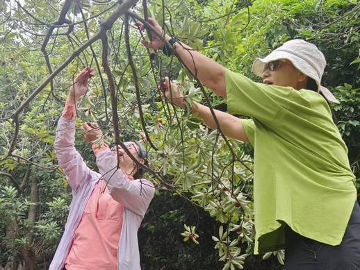 六月风暖,四明湖畔的梁弄镇已浸透杨梅香。我们来到梁弄镇山寨大王水果采摘园,挎上小篮子穿行林间,指尖轻托乌润果实,笑谈间比量着谁摘的杨梅更甜。