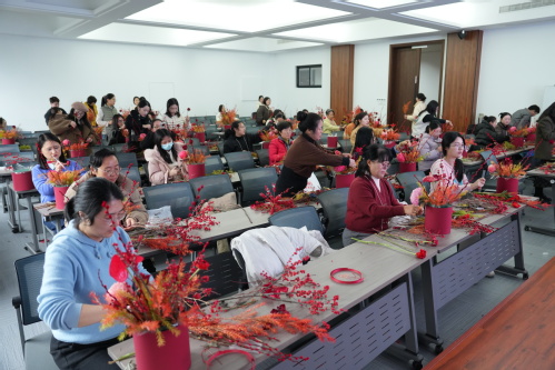 在实践环节,教职工们在老师的逐步指导下,从固定花泥、选择主花材开始,逐步加入副花材与补花材,通过高低错落、色彩搭配、线条延伸等手法,将原本散落的花叶巧妙组合成一件件独具匠心的插花作品。现场气氛温馨而专注,大家互相交流构思、分享技巧,手中渐渐绽放出一份份属于自己新春的“芬芳华章”。