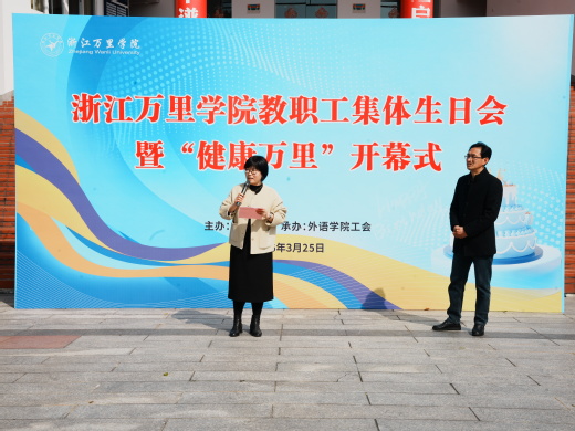 3月25日下午,由校工会主办,外语学院分工会承办的浙江万里学院教职工集体生日会暨“健康万里”开幕式在钱湖校区素拓小广场举行。校工会常务副主席杨忠辉、外语学院院长王洪林出席活动,公历生日在1-3月的教职工参加了本次活动。