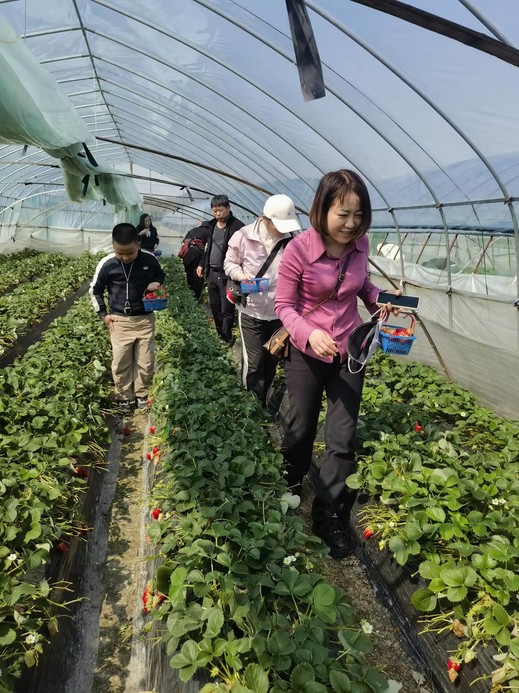 午后,趣味满满的奉化尚田草莓采摘环节正式开启。走进草莓种植基地,一颗颗红彤彤的草莓挂满藤蔓,饱满多汁、香甜诱人。教职工们手持果篮,穿梭于田垄之间,精心挑选、亲手采摘,体验农耕乐趣,现场欢声笑语不断,洋溢着轻松欢快的氛围。